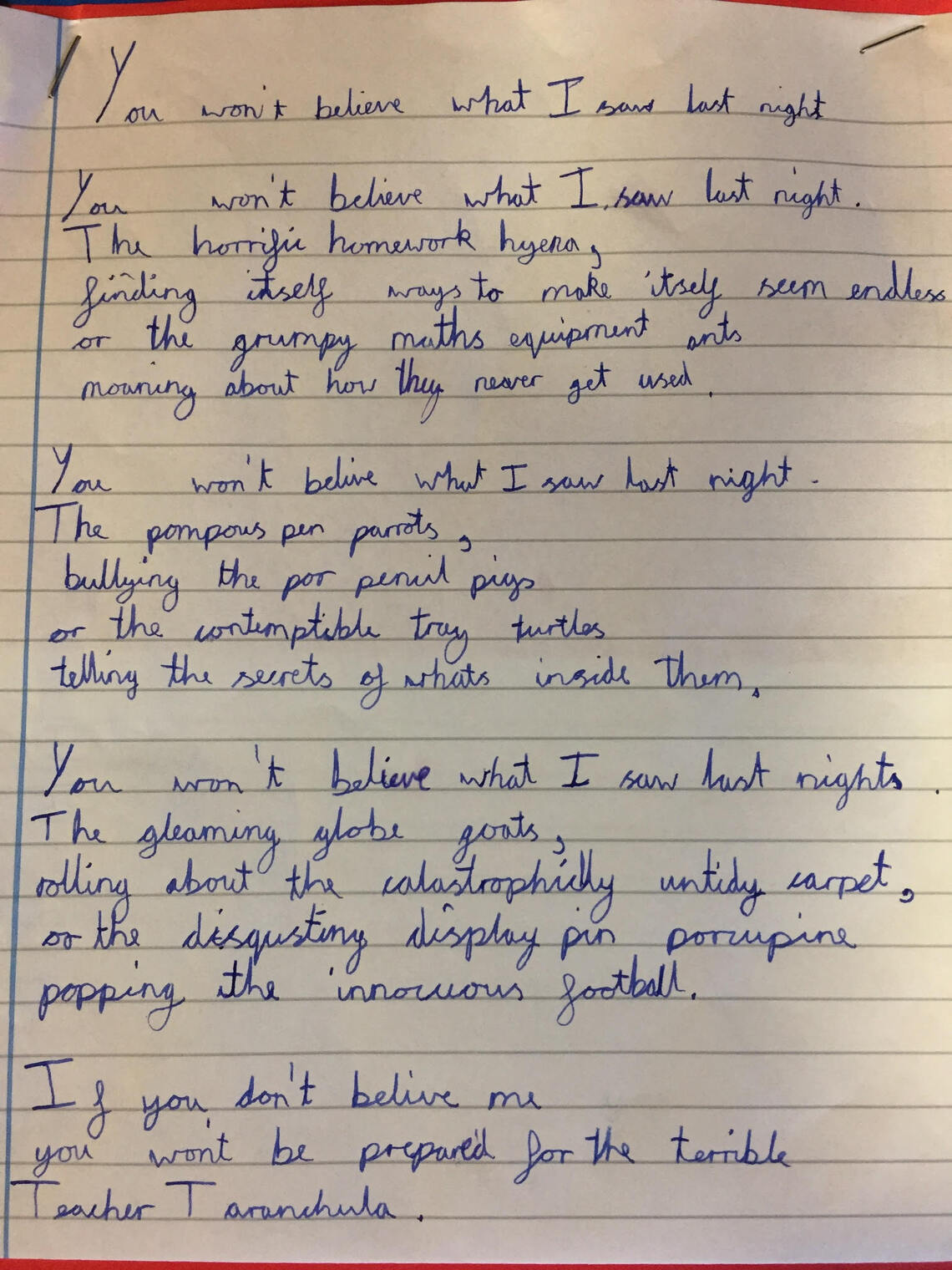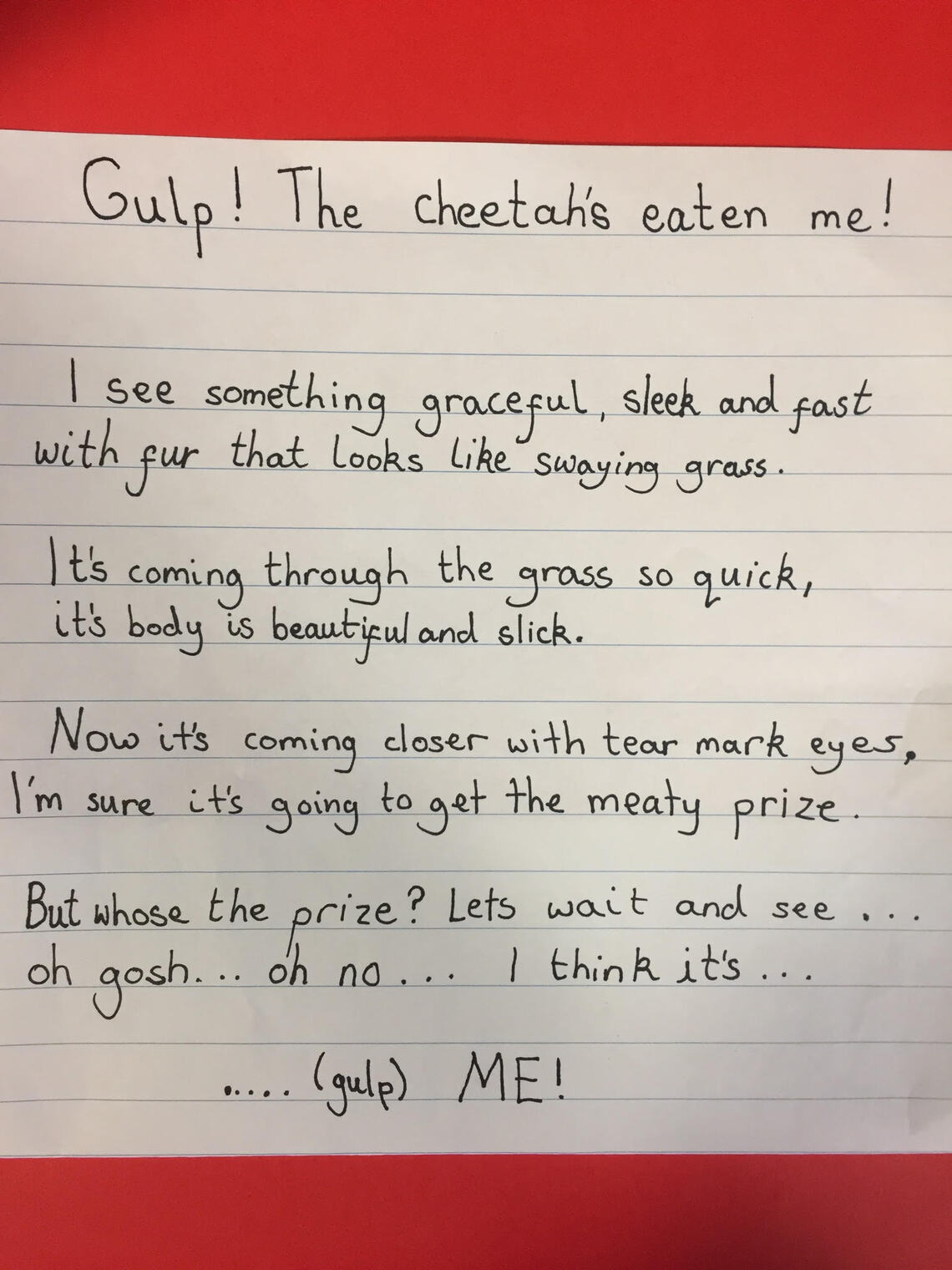 Joint winners in the Age 8-11 year (Y4, Y5, Y6) category were Joe (Y5), with "You won't believe what I saw last night", and Amelia (Y4), with "Gulp! The cheetah's eaten me!".